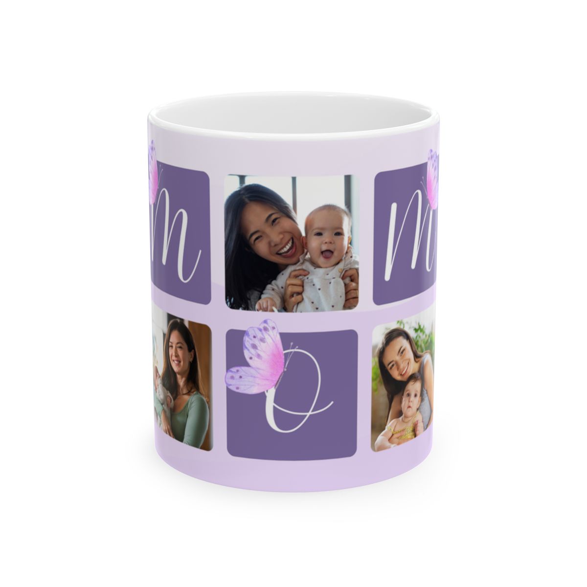 Personalized Purple butterfly mug featuring 5 pictures, perfect for moms this mother’s day. This mug adds a touch of personalization and warmth to your morning coffee or tea routine. Ideal gift for Mother’s Day, birthdays or any special occasion.