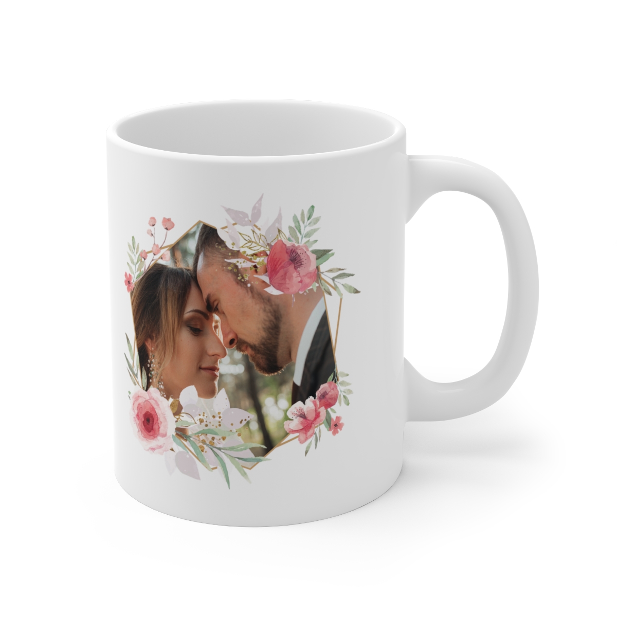 Wedding mug 11oz (0.33l) in size. Each mug is made with durable white ceramic that is perfect for wedding displays and its gloss coating makes for looks that are both pristine and long-lasting. The design features hand painted watercolor art of rose gold branches, petals & flowers and hand painted frame that is optimised in photoshop. Design is printed on a?durable heart-shaped handle white ceramic mug.